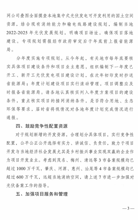 4.鼓勵(lì)競爭性配置資源:考慮到茂名、梅州、清遠(yuǎn)等3市備案規(guī)模均已超過1000萬千瓦,肇慶、河源、惠州、汕尾等4市備案規(guī)模均已超過600萬千瓦,遠(yuǎn)超當(dāng)?shù)叵{空間,請上述7市進(jìn)一步加強(qiáng)對光伏備案工作的指導(dǎo)。