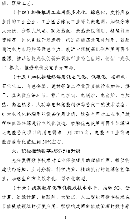 加快推進終端用能電氣化、低碳化。在鋼鐵、石化化工、有色金屬、建材等重點行業(yè)及其他行業(yè)加熱、烘干、蒸汽供應(yīng)等環(huán)節(jié),推廣電爐鋼、電鍋爐、電窯爐、電加熱、高溫?zé)岜谩⒋蠊β孰姛醿δ苠仩t等替代工藝技術(shù)裝備,擴大電氣化終端用能設(shè)備使用比例。穩(wěn)妥有序?qū)I(yè)生產(chǎn)過程中低溫?zé)嵩催M行電氣化改造。鼓勵優(yōu)先使用可再生能源滿足電能替代項目的用電需求。到2025年,電能占工業(yè)終端能源消費比重達到30%左右。