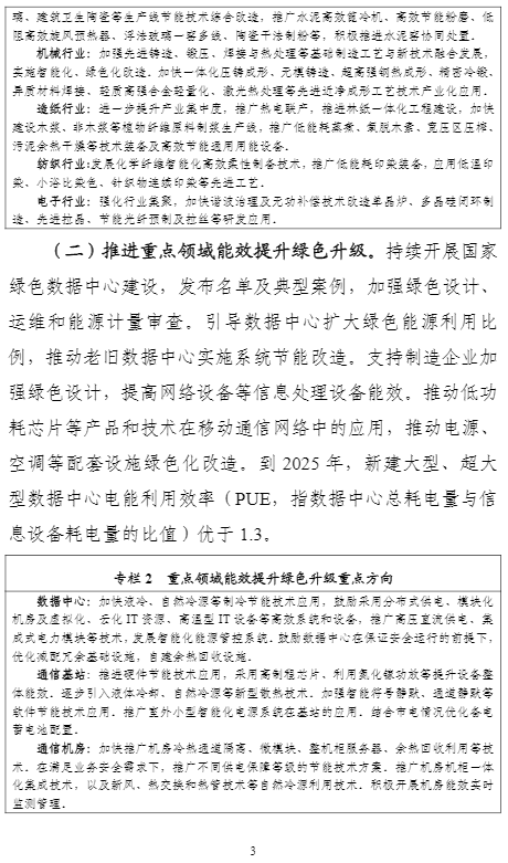 計劃提出,到2025年,重點工業(yè)行業(yè)能效全面提升,數(shù)據(jù)中心等重點領(lǐng)域能效明顯提升,綠色低碳能源利用比例顯著提高,節(jié)能提效工藝技術(shù)裝備廣泛應(yīng)用,標準、服務(wù)和監(jiān)管體系逐步完善,鋼鐵、石化化工、有色金屬、建材等行業(yè)重點產(chǎn)品能效達到國際先進水平,規(guī)模以上工業(yè)單位增加值能耗比2020年下降13.5%。能盡其用、效率至上成為市場主體和公眾的共同理念和普遍要求,節(jié)能提效進一步成為綠色低碳的“第一能源”和降耗減碳的首要舉措。