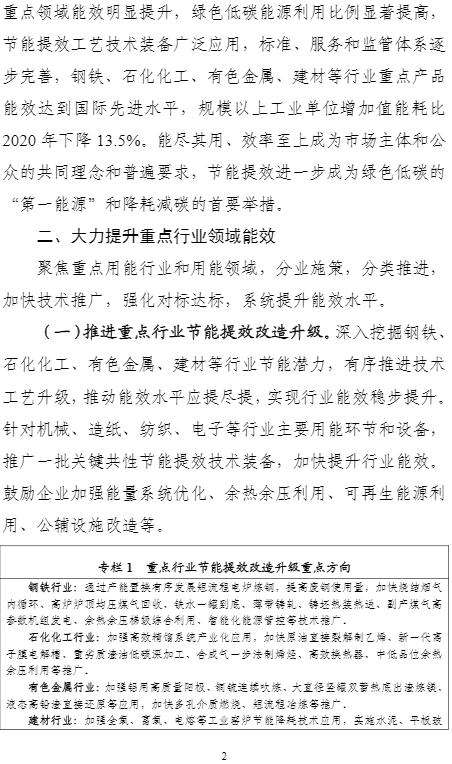 計(jì)劃提出,到2025年,重點(diǎn)工業(yè)行業(yè)能效全面提升,數(shù)據(jù)中心等重點(diǎn)領(lǐng)域能效明顯提升,綠色低碳能源利用比例顯著提高,節(jié)能提效工藝技術(shù)裝備廣泛應(yīng)用,標(biāo)準(zhǔn)、服務(wù)和監(jiān)管體系逐步完善,鋼鐵、石化化工、有色金屬、建材等行業(yè)重點(diǎn)產(chǎn)品能效達(dá)到國(guó)際先進(jìn)水平,規(guī)模以上工業(yè)單位增加值能耗比2020年下降13.5%。能盡其用、效率至上成為市場(chǎng)主體和公眾的共同理念和普遍要求,節(jié)能提效進(jìn)一步成為綠色低碳的“第一能源”和降耗減碳的首要舉措。