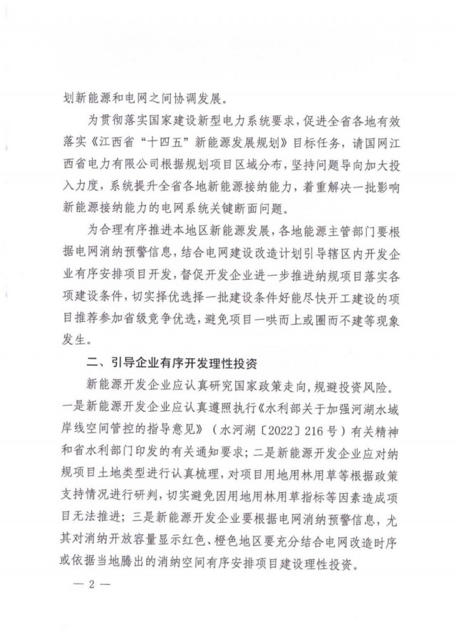 文件強(qiáng)調(diào),新能源開發(fā)企業(yè)應(yīng)認(rèn)真遵照執(zhí)行《水利部關(guān)于加強(qiáng)河湖水域岸線空間管控的指導(dǎo)意見》(水河湖〔2022〕216號)有關(guān)精神和省水利部門印發(fā)的有關(guān)通知要求;二是新能源開發(fā)企業(yè)應(yīng)對納規(guī)項(xiàng)目土地類型進(jìn)行認(rèn)真梳理,對項(xiàng)目用地用林用草等根據(jù)政策支持情況進(jìn)行研判,切實(shí)避免因用地用林用草指標(biāo)等因素造成項(xiàng)目無法推進(jìn);三是新能源開發(fā)企業(yè)要根據(jù)電網(wǎng)消納預(yù)警信息,尤其對消納開放容量顯示紅色、橙色地區(qū)要充分結(jié)合電網(wǎng)改造時(shí)序或依據(jù)當(dāng)?shù)仳v出的消納空間有序安排項(xiàng)目建設(shè)理性投資。