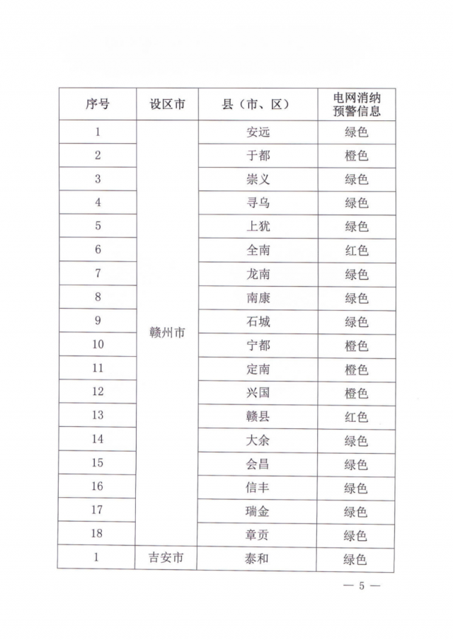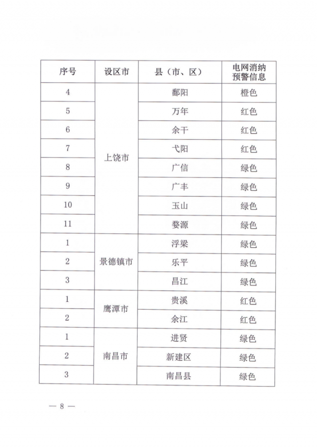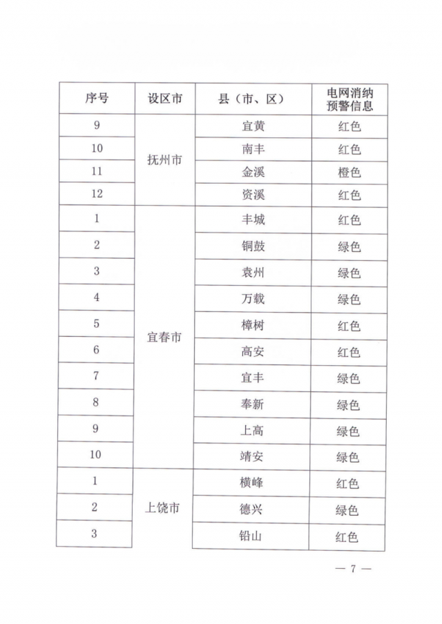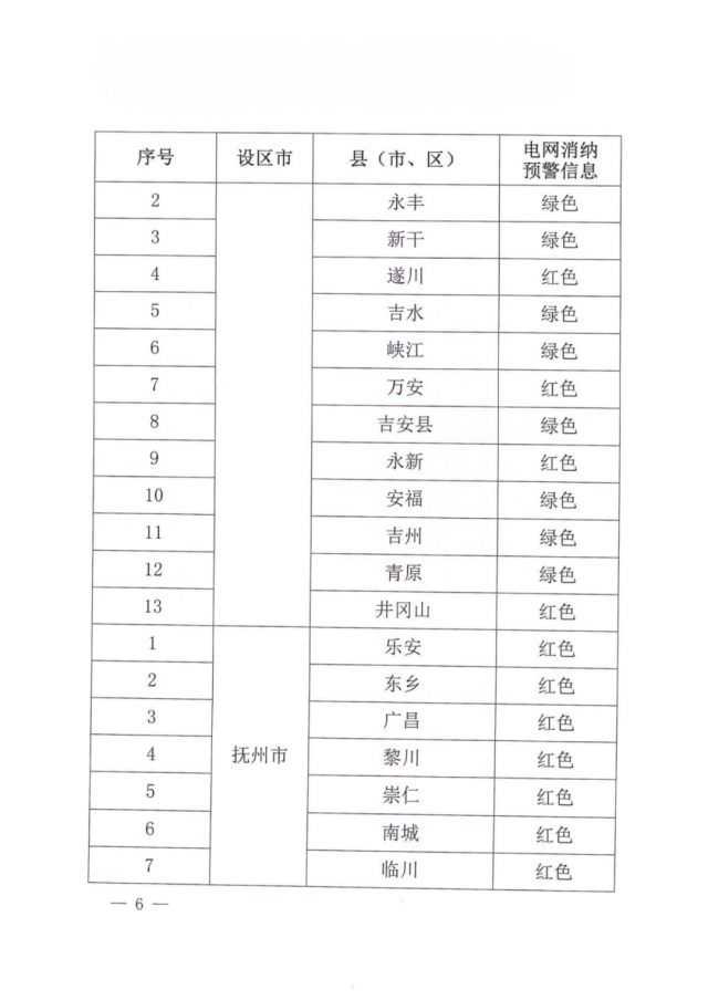 文件指出,由于新能源可開發(fā)容量呈現(xiàn)飽和狀態(tài),故給出部分市縣電網(wǎng)新能源可開放容量表。江西的94個(gè)縣市區(qū)中,已經(jīng)有27個(gè)電網(wǎng)消納預(yù)警信息為紅色,12個(gè)為橙色。