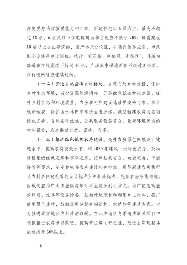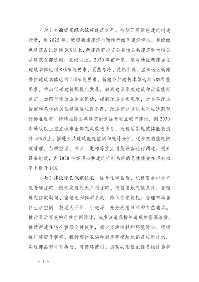 《方案》指出,全面提高綠色低碳建筑水平。持續(xù)開展綠色建筑創(chuàng)建行動,到2025年,城鎮(zhèn)新建建筑全面執(zhí)行綠色建筑標(biāo)準(zhǔn),星級綠色建筑占比達(dá)到30%以上,新建政府投資公益性公共建筑和大型公共建筑全部達(dá)到一星級以上。2030年前嚴(yán)寒、寒冷地區(qū)新建居住建筑本體達(dá)到83%節(jié)能要求,夏熱冬冷、夏熱冬暖、溫和地區(qū)新建居住建筑本體達(dá)到75%節(jié)能要求,新建公共建筑本體達(dá)到78%節(jié)能要求。推動低碳建筑規(guī)?;l(fā)展,鼓勵建設(shè)零碳建筑和近零能耗建筑。