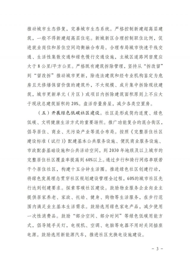 《方案》提出開展綠色低碳社區(qū)建設(shè)。推廣功能復(fù)合的混合街區(qū),倡導(dǎo)居住、商業(yè)、無污染產(chǎn)業(yè)等混合布局。按照《完整居住社區(qū)建設(shè)標(biāo)準(zhǔn)(試行)》配建基本公共服務(wù)設(shè)施、便民商業(yè)服務(wù)設(shè)施、市政配套基礎(chǔ)設(shè)施和公共活動空間,到2030年地級及以上城市的完整居住社區(qū)覆蓋率提高到60%以上。通過步行和騎行網(wǎng)絡(luò)串聯(lián)若干個(gè)居住社區(qū),構(gòu)建十五分鐘生活圈。推進(jìn)綠色社區(qū)創(chuàng)建行動,將綠色發(fā)展理念貫穿社區(qū)規(guī)劃建設(shè)管理全過程,60%的城市社區(qū)先行達(dá)到創(chuàng)建要求。探索零碳社區(qū)建設(shè)。鼓勵物業(yè)服務(wù)企業(yè)向業(yè)主提供居家養(yǎng)老、家政、托幼、健身、購物等生活服務(wù),在步行范圍內(nèi)滿足業(yè)主基本生活需求。鼓勵選用綠色家電產(chǎn)品,減少使用一次性消費(fèi)品。鼓勵“部分空間、部分時(shí)間”等綠色低碳用能方式,倡導(dǎo)隨手關(guān)燈,電視機(jī)、空調(diào)、電腦等電器不用時(shí)關(guān)閉插座電源。鼓勵選用新能源汽車,推進(jìn)社區(qū)充換電設(shè)施建設(shè)。