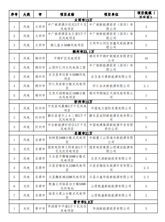 為推動(dòng)全省新能源項(xiàng)目健康可持續(xù)發(fā)展,省能源局組織各市對(duì)2020年及之前長(zhǎng)期占用資源、遲遲未能建成的風(fēng)電光伏發(fā)電項(xiàng)目進(jìn)行了梳理。相關(guān)地市上報(bào)了本地區(qū)擬廢止項(xiàng)目清單,經(jīng)我局匯總,擬將云崗區(qū)協(xié)鑫雅兒崖鄉(xiāng)等54個(gè),總計(jì)規(guī)模138.8萬(wàn)千瓦風(fēng)電光伏發(fā)電項(xiàng)目予以廢止,現(xiàn)予公示。相關(guān)企業(yè)如有異議,請(qǐng)向市能源局提出書(shū)面意見(jiàn),并在公示期(5個(gè)工作日)內(nèi),由市能源局上報(bào)省能源局。