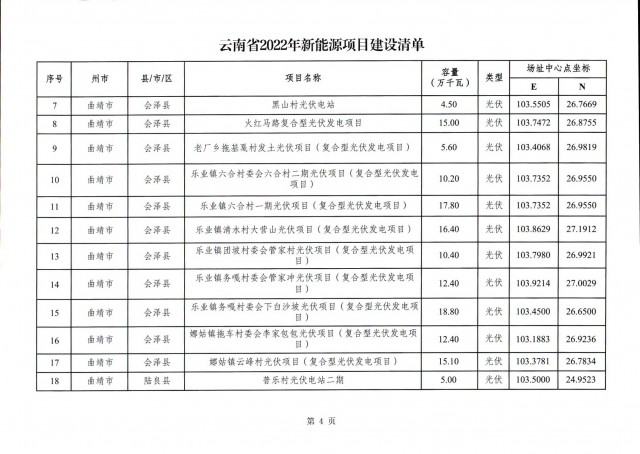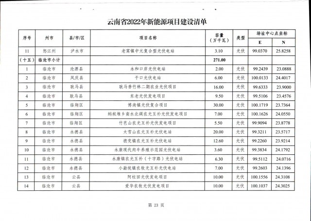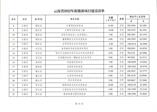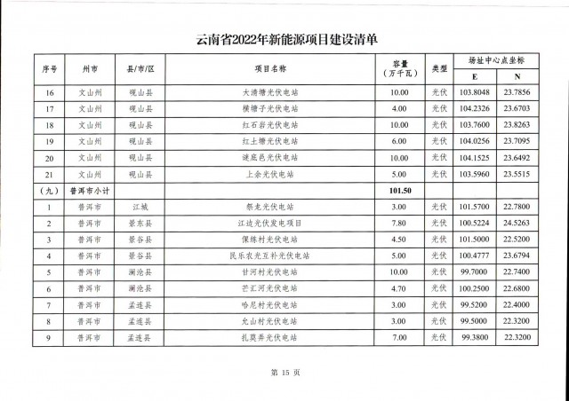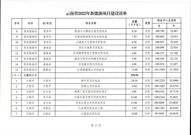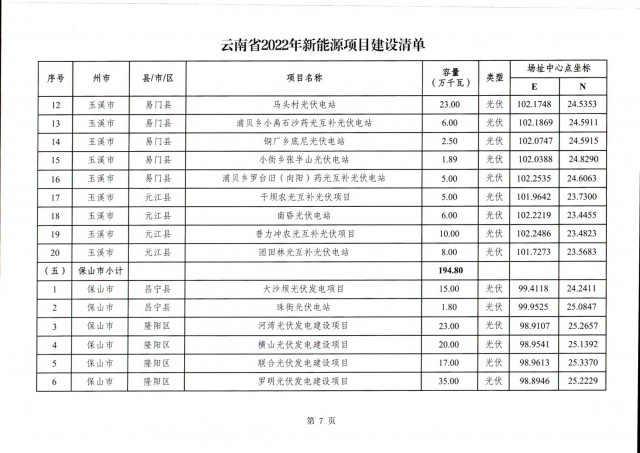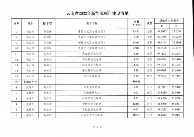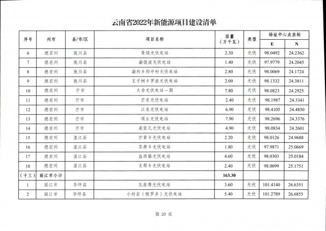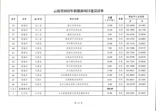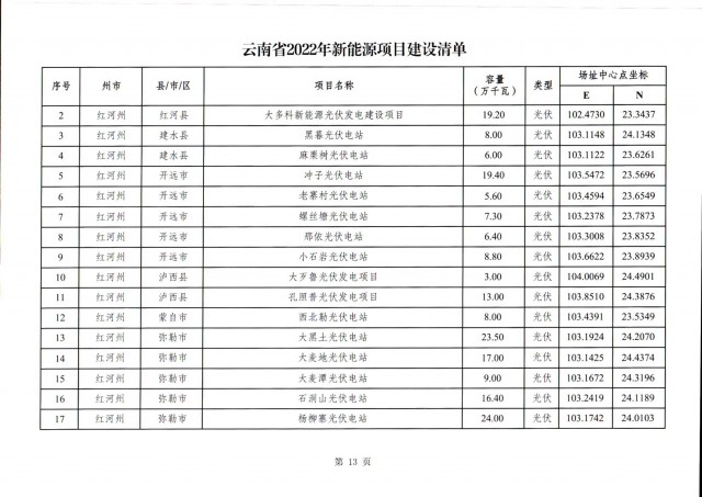 根據(jù)項(xiàng)目清單來(lái)看(附件查看清單),昆明市193.8萬(wàn)千瓦、昭通市129.9萬(wàn)千瓦、曲靖市440.6萬(wàn)千瓦、玉溪市216.89萬(wàn)千瓦、保山市194.8萬(wàn)千瓦、楚雄州556.46萬(wàn)千瓦、紅河州206.6萬(wàn)千瓦、文山州231萬(wàn)千瓦、普洱市101.5萬(wàn)千瓦、西雙版納州91.5萬(wàn)千瓦、大理州259.99萬(wàn)千瓦、德宏州56.1萬(wàn)千瓦、麗江市163.3萬(wàn)千瓦、怒江州87.1萬(wàn)千瓦、臨滄市271萬(wàn)千瓦。