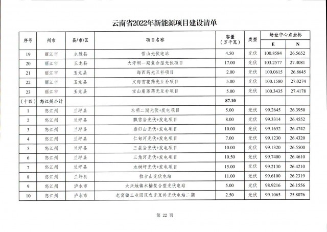 事實(shí)上,此前7月12日云南省能源局就發(fā)布了《關(guān)于征求2022年新能源建設(shè)方案》和《關(guān)于征求2022年新能源項(xiàng)目投產(chǎn)并網(wǎng)有關(guān)意見(jiàn)建議的函》,文件中云南省公示了共1702.04萬(wàn)千瓦的新能源投產(chǎn)并網(wǎng)的項(xiàng)目清單,其中光伏975.6萬(wàn)千瓦,風(fēng)電726.44萬(wàn)千瓦。(點(diǎn)擊查看:云南17GW新能源并網(wǎng)項(xiàng)目清單:三峽、華能領(lǐng)銜,云南能投、華電、大唐等超1GW)此次正式下發(fā)的文件做出了一些變動(dòng)。