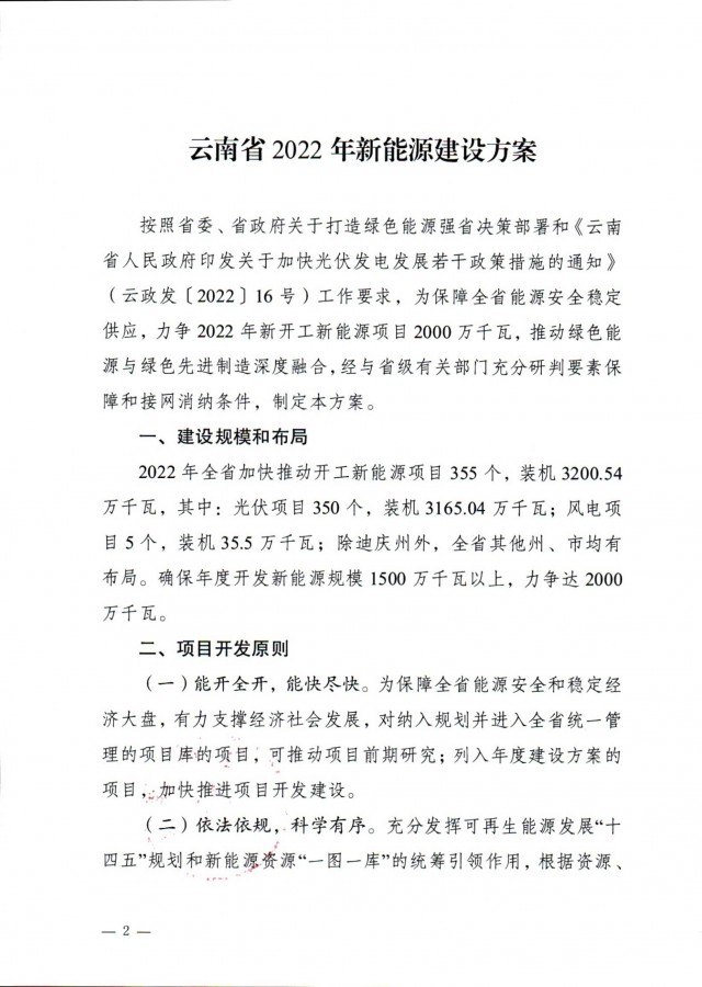 7月22日,云南省能源局正式印發(fā)了《云南省2022年新能源建設(shè)方案通知》。明確了2022年云南全省加快推動(dòng)開(kāi)工新能源項(xiàng)目355個(gè),裝機(jī)3200.54萬(wàn)千瓦,其中光伏項(xiàng)目350個(gè),裝機(jī)3165.04萬(wàn)千瓦;風(fēng)電項(xiàng)目5個(gè),裝機(jī)35.5萬(wàn)千瓦;除迪慶州外,全省其他州、市均有布局。確保年度開(kāi)發(fā)新能源規(guī)模1500萬(wàn)千瓦以上,力爭(zhēng)達(dá)2000萬(wàn)千瓦。