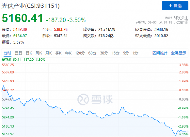 8月3日,受外圍利空因素影響,A股市場(chǎng)避險(xiǎn)情緒高漲。受此影響,光伏板塊尾盤出現(xiàn)大幅跳水,中證光伏產(chǎn)業(yè)指數(shù)(CSI:931151)大跌3.5%,報(bào)收5160點(diǎn)。