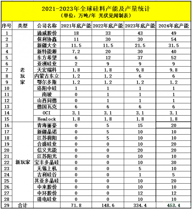 2021年以來,硅料老玩家大舉擴產(chǎn),新玩家實力雄厚如過江之鯽,這一輪硅料牛市涌現(xiàn)了將近30家硅料企業(yè)。光伏見聞根據(jù)公開消息不完全統(tǒng)計,2022年底,硅料企業(yè)新老玩家產(chǎn)能將達(dá)到148.6萬噸,2023年底,硅料企業(yè)產(chǎn)能則將達(dá)到334.4萬噸,如果產(chǎn)能完全釋放,保守估計這些硅料可生產(chǎn)的組件則分別為505GW、1136GW。