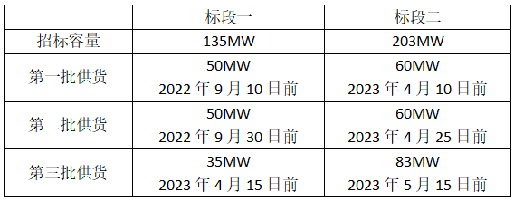從招標(biāo)公告看,一、二標(biāo)段項(xiàng)目所在地均為新疆昌吉,其中一標(biāo)段招標(biāo)容量135MW,二標(biāo)段招標(biāo)容量203MW,對(duì)組件產(chǎn)品的要求均為雙面雙玻組件,峰值功率不低于540Wp。