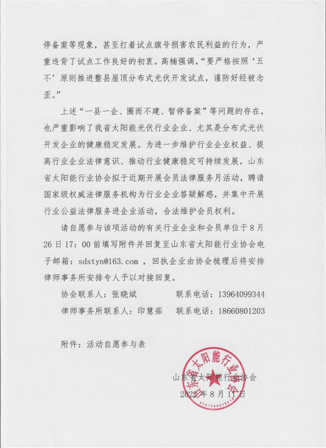 請(qǐng)自愿參與該項(xiàng)活動(dòng)的有關(guān)行業(yè)企業(yè)和會(huì)員單位于8月26日17:00 前填寫(xiě)附件并回復(fù)至山東省太陽(yáng)能行業(yè)協(xié)會(huì)電子郵箱:sdstyn@163.com,回執(zhí)企業(yè)由協(xié)會(huì)梳理后將安排律師事務(wù)所安排專人予以對(duì)接回復(fù)。