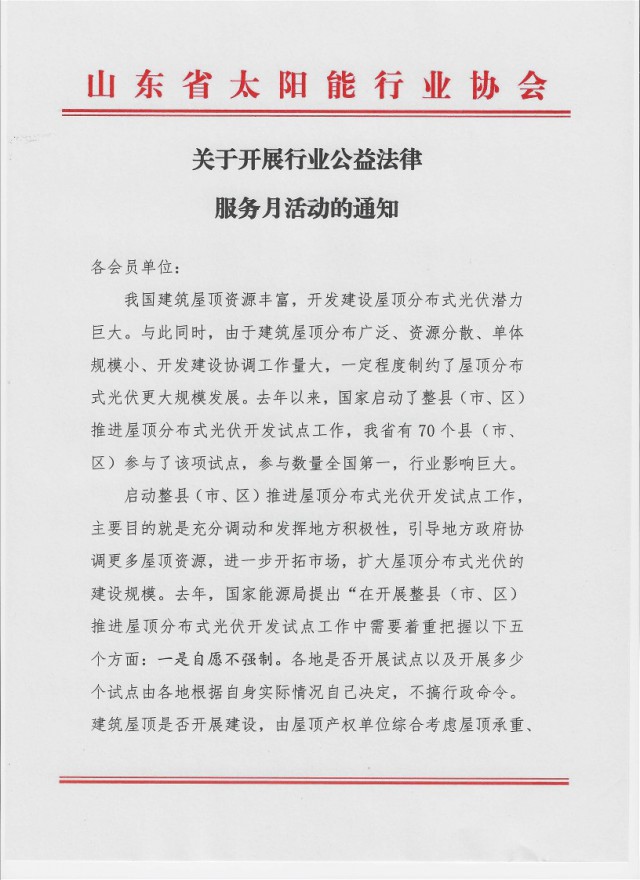 上述“一縣一企、圈而不建、暫停備案”等問(wèn)題的存在,也嚴(yán)重影響了我省太陽(yáng)能光伏行業(yè)企業(yè)、尤其是分布式光伏開(kāi)發(fā)企業(yè)的健康穩(wěn)定發(fā)展。為進(jìn)一步維護(hù)行業(yè)企業(yè)權(quán)益、提高行業(yè)企業(yè)法律意識(shí)、推動(dòng)行業(yè)健康穩(wěn)定可持續(xù)發(fā)展,山東省太陽(yáng)能行業(yè)協(xié)會(huì)擬于近期開(kāi)展會(huì)員法律服務(wù)月活動(dòng),聘請(qǐng)國(guó)家級(jí)權(quán)威法律服務(wù)機(jī)構(gòu)為行業(yè)企業(yè)答疑解惑,并集中開(kāi)展行業(yè)公益法律服務(wù)進(jìn)企業(yè)活動(dòng),合法維護(hù)會(huì)員權(quán)利。