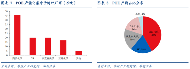 目前全球范圍內(nèi)POE產(chǎn)能十分集中,產(chǎn)能主要集中在陶氏、??松梨凇⑷?、SK等公司,其中陶氏產(chǎn)能46萬噸,占全球產(chǎn)能的42%;??松梨诤蚐K,產(chǎn)能均為20萬噸,占比均為19%,三井化學(xué)擁有17萬噸的產(chǎn)能,產(chǎn)能占比約16%。
