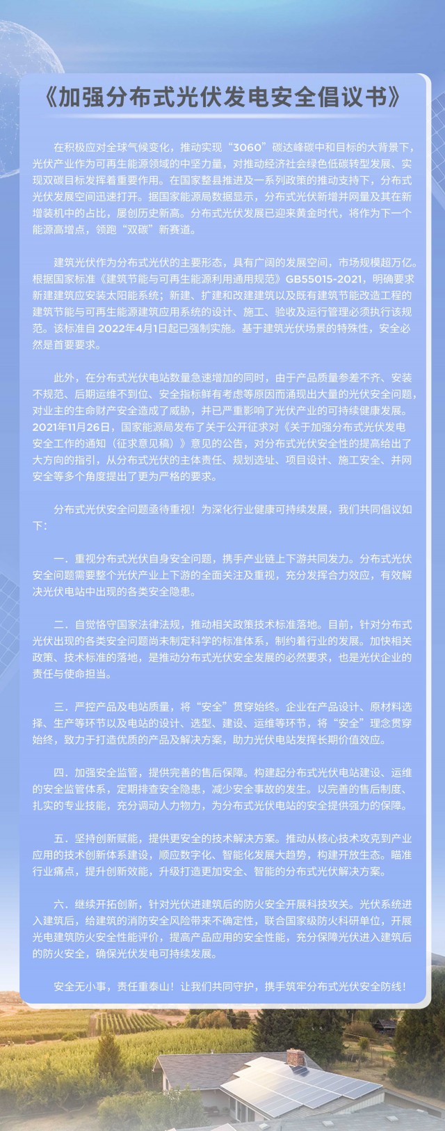 前不久,昱能科技聯(lián)合中國(guó)建筑科學(xué)研究院防火研究所、華為數(shù)字能源、優(yōu)得運(yùn)維、固德威、史陶比爾、杭州龍焱、武漢日新等8家單位,共同發(fā)起了行業(yè)首個(gè)關(guān)于分布式光伏發(fā)電安全倡議及發(fā)布了《加強(qiáng)分布式光伏發(fā)電安全倡議書(shū)》,號(hào)召行業(yè)聚焦光伏安全問(wèn)題。從《倡議書(shū)》內(nèi)容看,除了強(qiáng)調(diào)遵守相關(guān)法律法規(guī),重視安全問(wèn)題以外,還需要光伏企業(yè)在產(chǎn)品設(shè)計(jì)、原材料選擇、生產(chǎn)等環(huán)節(jié)以及電站的設(shè)計(jì)、選型、建設(shè)、運(yùn)維等環(huán)節(jié),將“安全”理念貫穿始終,致力于打造優(yōu)質(zhì)的產(chǎn)品及解決方案。