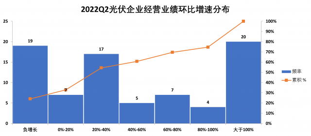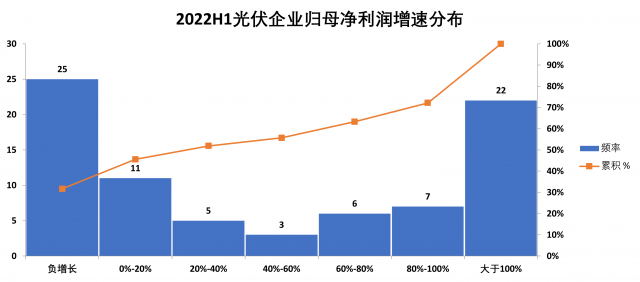 相比于營(yíng)收的普漲態(tài)勢(shì),光伏企業(yè)的經(jīng)營(yíng)業(yè)績(jī)卻出現(xiàn)顯著分化。2022年上半年,79家光伏企業(yè)的歸母凈利潤(rùn)總額達(dá)到650億元,平均增速為32%。其中,利潤(rùn)負(fù)增長(zhǎng)的企業(yè)占比高達(dá)32%,而業(yè)績(jī)翻倍增長(zhǎng)的企業(yè)占比亦達(dá)到28%,呈現(xiàn)顯著的“兩極分化”態(tài)勢(shì)。不過,與2021年不同的是,產(chǎn)業(yè)鏈中游的諸多專業(yè)化廠商紛紛迎來“困境反轉(zhuǎn)”,而業(yè)績(jī)出現(xiàn)下滑的企業(yè)多為競(jìng)爭(zhēng)力一般的中小市值企業(yè)。