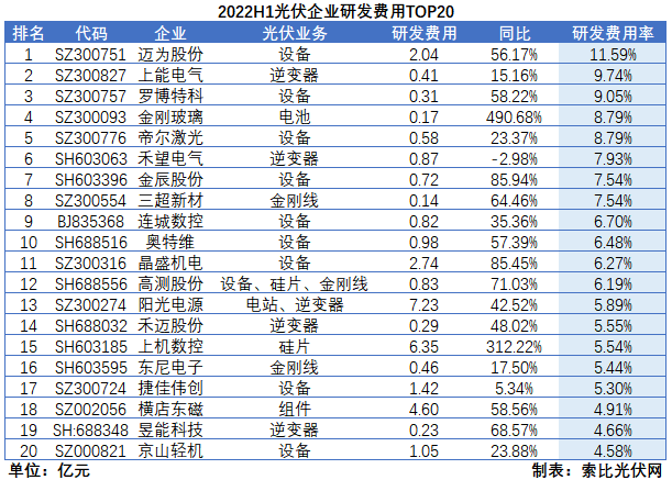 當(dāng)然,N型電池技術(shù)之所以能夠不斷取得突破性進(jìn)展,離不開生產(chǎn)設(shè)備的持續(xù)升級(jí)與迭代。在研發(fā)費(fèi)用率排名中,前20位中有10家是設(shè)備廠商,其中HJT設(shè)備龍頭邁為股份的研發(fā)費(fèi)用率更是高達(dá)11.59%。在近期的中報(bào)業(yè)績(jī)交流會(huì)中,邁為股份表示預(yù)計(jì)今年下半年HJT組件成本能夠與PERC組件持平,至2023年HJT電池片成本優(yōu)勢(shì)將會(huì)逐步顯現(xiàn)。