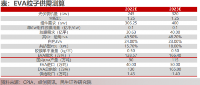 大家都在分析未來卡脖子在哪?行業(yè)分析師們經(jīng)過盤算產(chǎn)能情況得出EVA粒子會是比較缺的環(huán)節(jié)。