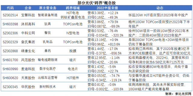 隨著“跨界潮”的愈演愈烈,A股市場中也有越來越多的企業(yè)有望復(fù)制上機數(shù)控、雙良節(jié)能的發(fā)展軌跡。在索比光伏網(wǎng)整理的“跨界”概念股名單中,多數(shù)企業(yè)的業(yè)績基數(shù)均較低,部分企業(yè)甚至還出現(xiàn)了一定程度的虧損。