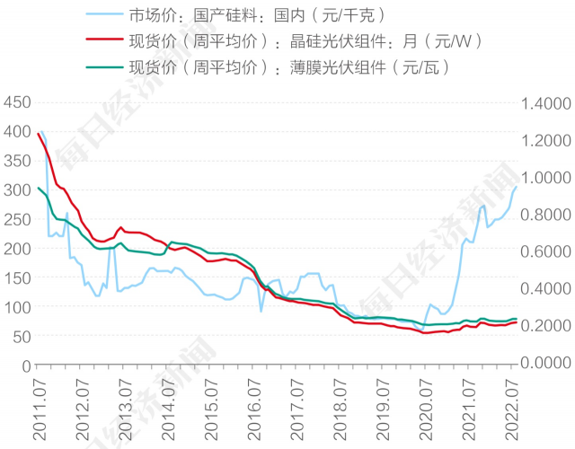 2011年7月開始下行以來(lái),至2022年7月國(guó)產(chǎn)硅料價(jià)格走出一條V形線,11年過(guò)去,還未達(dá)到當(dāng)時(shí)的價(jià)格水平 圖片來(lái)源:每經(jīng)記者 劉國(guó)梅 制圖