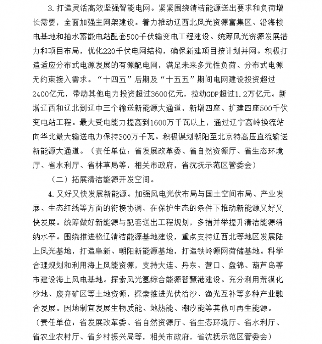 加強(qiáng)風(fēng)電光伏布局與國土空間布局、產(chǎn)業(yè)發(fā)展、生態(tài)紅線等方面的銜接協(xié)調(diào),在保護(hù)生態(tài)的條件下推動(dòng)新能源又好又快發(fā)展。統(tǒng)籌做好新能源與配套送出工程規(guī)劃,多措并舉提升清潔能源消納水平。圍繞推進(jìn)松遼清潔能源基地建設(shè),重點(diǎn)支持遼西北等地區(qū)發(fā)展陸上風(fēng)光基地,打造阜新、朝陽新能源基地,打造鐵嶺源網(wǎng)荷儲(chǔ)基地??茖W(xué)合理規(guī)劃和利用海上風(fēng)能資源,支持大連、丹東、營口、盤錦、葫蘆島等市建設(shè)海上風(fēng)電基地。探索風(fēng)光氫綜合能源智慧港建設(shè)。充分利用荒漠化沙地、廢棄礦區(qū)等土地資源,探索推進(jìn)光伏治沙、漁光互補(bǔ)等多種產(chǎn)業(yè)融合發(fā)展。因地制宜發(fā)展生物質(zhì)能、地?zé)崮堋⒊毕艿绕渌稍偕茉础?/p>