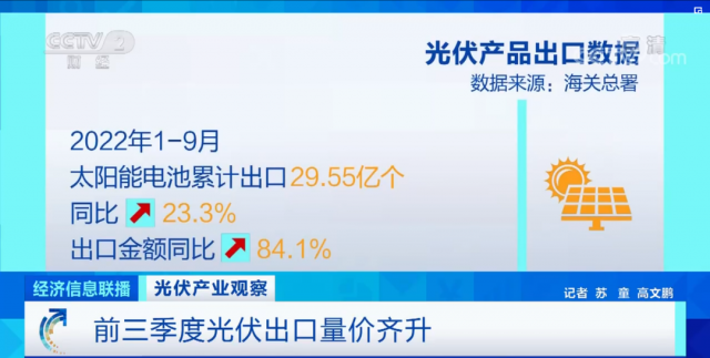 光伏產品的出口表現也超出預期,海關數據顯示,今年前9個月,太陽能電池累計出口29.55億個,同比增長23.3%,出口金額同比增加84.1%,實現量價齊升。