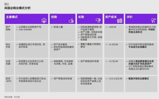 央國企更多考慮如何能更快速持有優(yōu)質(zhì)資產(chǎn),資產(chǎn)收購仍舊會是中短期的主流模式(如圖 6)??紤]到央國企的指標(biāo)壓力和集中式光伏的經(jīng)驗(yàn),通過從民營企業(yè)收購資產(chǎn)包能夠幫助其實(shí)現(xiàn)快速上量。但同時(shí)該模式存在諸多劣勢:例如資產(chǎn)分散且品質(zhì)不理想、資產(chǎn)獲取成本高、信息透明度有限、賣方話語權(quán)過高等問題。為完成國家任務(wù)指標(biāo),近年來央國企也試探性推進(jìn)資產(chǎn)成本更低的自建團(tuán)隊(duì)開發(fā)模式,但由于需要大量能力與團(tuán)隊(duì)建設(shè),自主開發(fā)暫不會不會成為主流模式。