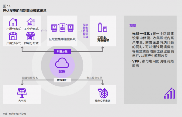 一邊是消納困局、一邊是電價(jià)短期波動風(fēng)險(xiǎn),戶用光伏發(fā)電正經(jīng)歷著來自市場的新考驗(yàn)。結(jié)合光伏發(fā)電商業(yè)模式判斷,未來光儲一體化和虛擬電網(wǎng)兩種創(chuàng)新模式的發(fā)展或成為針對上述挑戰(zhàn)的最優(yōu)解法(如圖 14)。