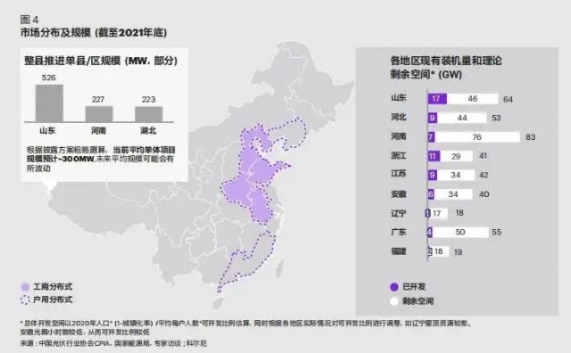 綜合考慮市場空間、綜合條件、產(chǎn)權(quán)模式等因素,科爾尼認(rèn)為山東、河北、河南、浙江、江蘇、安徽、遼寧、廣東與福建為未來整縣推進(jìn)領(lǐng)域的九大高潛力市場。其中,山東、河北、河南地區(qū)雖競爭激烈,但可開發(fā)空間仍十分可觀;浙江、江蘇由于居民投資意識強(qiáng),整體出售市場更具吸引力;安徽、遼寧、廣東、福建綜合條件優(yōu)勢明顯,建議重點(diǎn)布局。根據(jù)測算,當(dāng)前整縣推進(jìn)的平均單體項(xiàng)目規(guī)模預(yù)計(jì)在300MW 左右(如圖 4)。