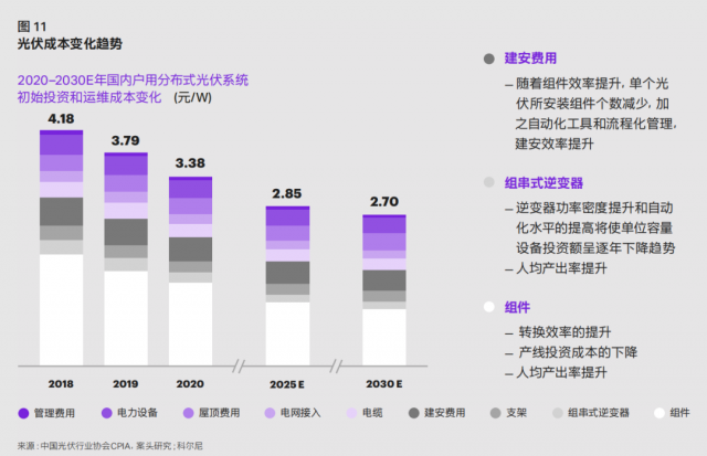 上網(wǎng)電價(jià)趨于穩(wěn)定的同時(shí),光伏投資及發(fā)電成本將進(jìn)一步下降,帶動盈利能力提升。科爾尼預(yù)計(jì),在 2025 年國內(nèi)戶用分布式光伏系統(tǒng)初始投資和運(yùn)維成本將下降至 2.85 元/ 瓦,并 于 2030 年進(jìn)一步降至約 2.70 元 / 瓦( 如 圖11)。