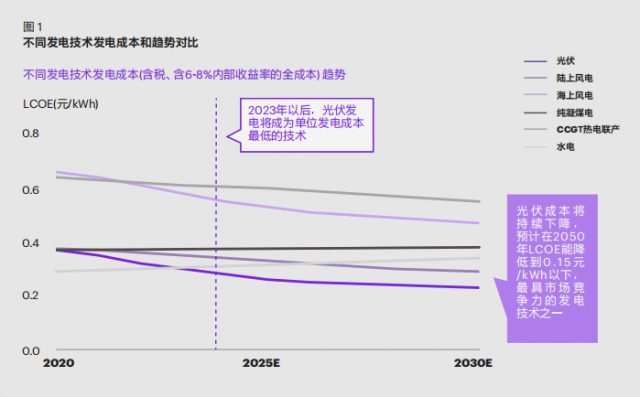 能源結(jié)構(gòu)調(diào)整無疑是能源戰(zhàn)略中最重要的一環(huán)。在眾多新能源發(fā)展路線中,光伏是最優(yōu)質(zhì)的選項(xiàng)之一,光伏發(fā)電技術(shù)成本優(yōu)勢突出。科爾尼預(yù)測,到 2023 年后,光伏發(fā)電的平準(zhǔn)化度電成本(LCOE)將在所有發(fā)電技術(shù)中達(dá)到最低,并預(yù)計(jì)在 2050 年進(jìn)一步下降至 0.15 元 /kWh(如圖 1)。成本優(yōu)勢下,光伏有潛力成為未來中長期發(fā)展最快的細(xì)分賽道。