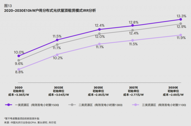 系統(tǒng)成本的大幅下降將大幅提升收益率。據(jù)科爾尼預(yù)測,在未來三類資源區(qū)的屋頂租賃模式 IRR 都將穩(wěn)步上升,并將 于 2030 年分別增至 13.3%、12.9% 和 11.9%(如圖13)。