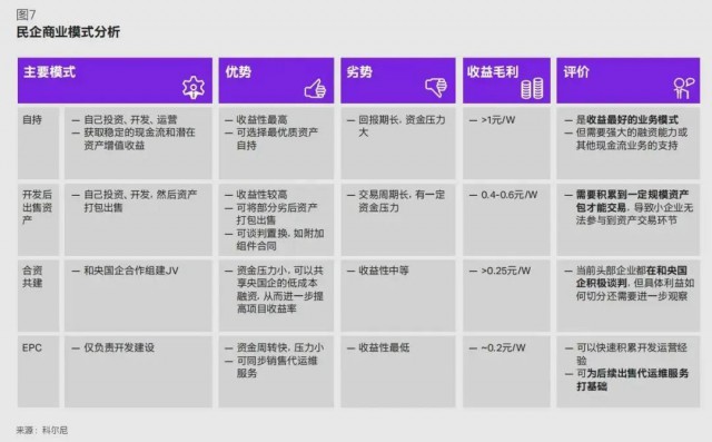 自持資產(chǎn)包是民企的主流業(yè)務(wù)模式。民企通過全程進(jìn)行投資、開發(fā)與運(yùn)營,獲取穩(wěn)定的現(xiàn)金流和潛在資產(chǎn)增值收益,是當(dāng)前收益最好的模式,毛利可超過 1 元 /W。但由于對資金要求較高且回報(bào)周期長,通常需要強(qiáng)大的融資能力或其他現(xiàn)金流業(yè)務(wù)的支持。