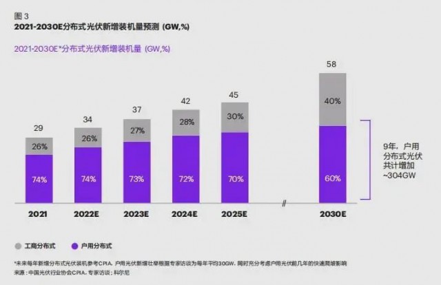 根據(jù)市場趨勢,科爾尼認(rèn)為, 2025 年以前戶用光伏會在政策和盈利性提升驅(qū)動下大幅提速,后期隨著整縣推進(jìn)結(jié)束,預(yù)期 2025-2030 增速會略有放緩。保守預(yù)計(jì)中國市場到 2030 年將累計(jì)增加戶用光伏超過 300GW,市場空間廣闊(如圖 3)。