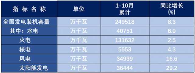 截至今年10月底,全國(guó)累計(jì)發(fā)電裝機(jī)容量約24.952億千瓦。其中,光電3.644億千瓦,風(fēng)電3.494億千瓦,水電4.075億千瓦,核電0.555億千瓦,火電13.163。