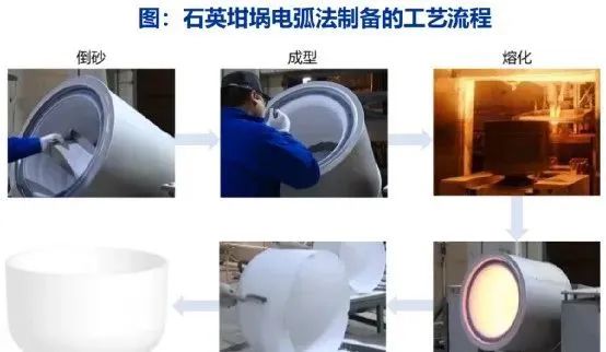 電弧法是制備石英坩堝的主流制備技術(shù)。將高純的石英砂原料倒入坩堝模具內(nèi),通過(guò)成型裝置將石英砂原料均勻的成型在模具的內(nèi)表面以成型坩堝坯,然后將坩堝模具整體移入電弧熔制爐內(nèi),通過(guò)石墨電極釋放高溫電弧使石英砂熔化,最后快速冷卻形成石英坩堝毛坯。石英坩堝分為內(nèi)層透明層、中層氣泡復(fù)合層和外層薄氣泡層,各層質(zhì)量占比分別為25%-70%、20%-40%和5%-30%,通常比例為4:3:4或者3:4:3。
