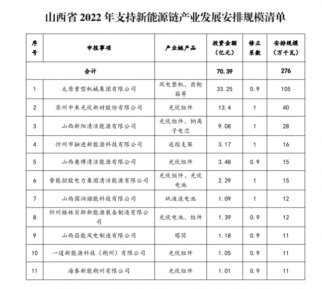根據(jù)《山西省支持新能源產(chǎn)業(yè)發(fā)展2022年工作方案》精神,在各市和相關(guān)企業(yè)申報(bào)的基礎(chǔ)上,省能源局委托省投資咨詢和發(fā)展規(guī)劃院組織了2022年支持新能源產(chǎn)業(yè)發(fā)展風(fēng)電光伏發(fā)電建設(shè)規(guī)模評(píng)審,評(píng)審確定了17家企業(yè)符合安排標(biāo)準(zhǔn),擬安排風(fēng)電光伏建設(shè)規(guī)模372萬千瓦,納入年度建設(shè)計(jì)劃。其中:新能源產(chǎn)業(yè)鏈企業(yè)11個(gè)家,安排規(guī)模276萬千瓦;煤電調(diào)峰能力建設(shè)企業(yè)6家,安排96萬千瓦。