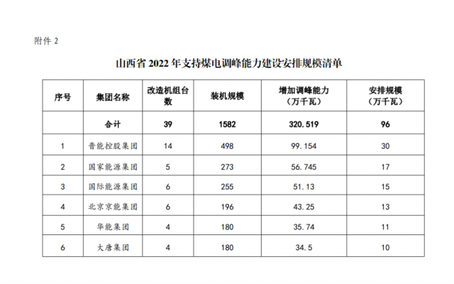 在煤電調(diào)峰安排清單中,主要企業(yè)為晉能、國家能源集團(tuán)、山西國際、京能、華能、大唐等6家央國企,增加調(diào)峰能力3.2GW,安排新能源規(guī)模0.96GW。