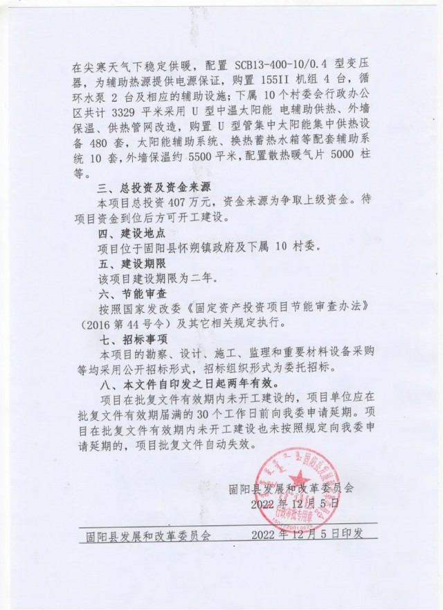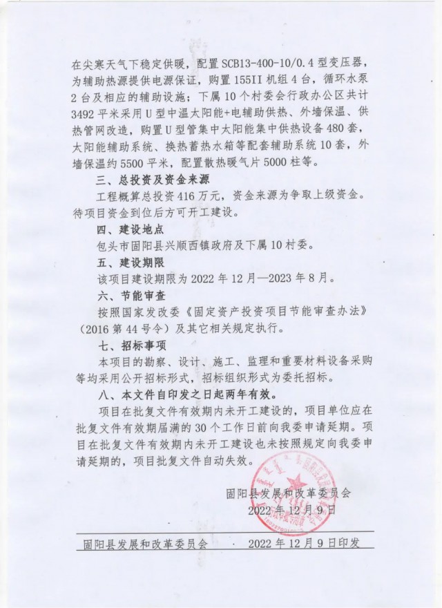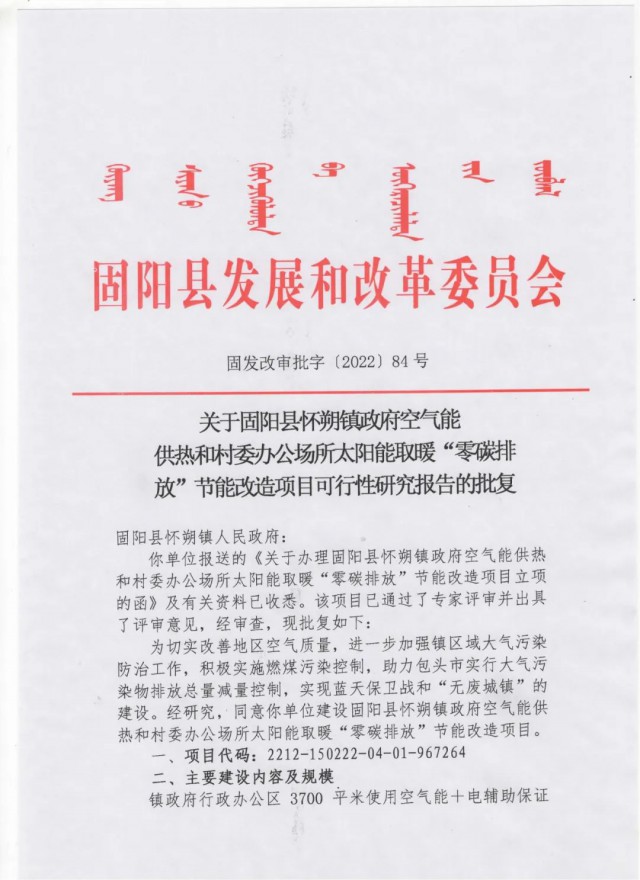 《固陽縣懷朔鎮(zhèn)政府空氣能供熱和村委辦公場(chǎng)所太陽能取暖"零碳排放”節(jié)能改造項(xiàng)目批復(fù)公示》