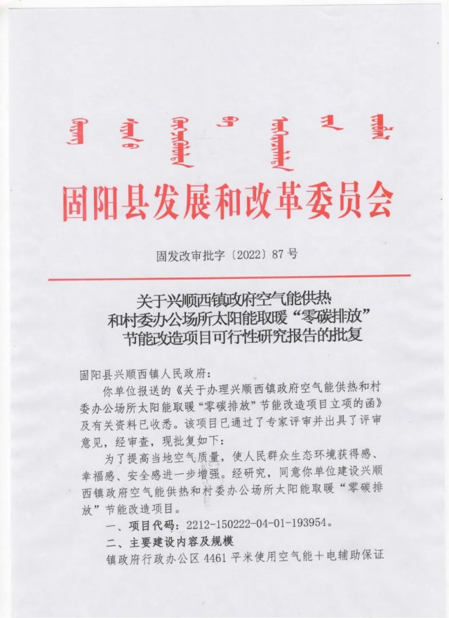 《固陽縣興順西鎮(zhèn)政府空氣能供熱和村委辦公場(chǎng)所太陽能取暖“零碳排放”節(jié)能改造項(xiàng)目批復(fù)公示》
