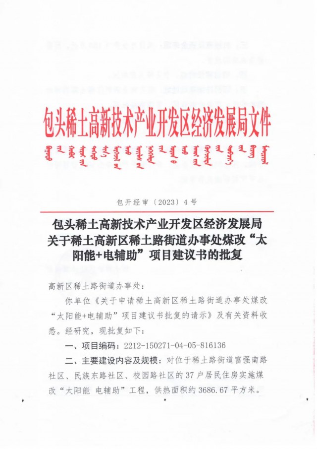《稀土高新區(qū)稀土路街道辦事處煤改“太陽能電輔助”項(xiàng)目批復(fù)公示》