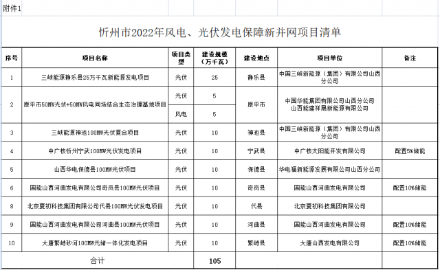 通知指出:2022年度山西省能源局共下達(dá)忻州市風(fēng)電、光伏發(fā)電項(xiàng)目共27個(gè)326萬千瓦,其中下達(dá)2022年度保障性并網(wǎng)項(xiàng)目9個(gè)105萬千瓦,下達(dá)支持新能源產(chǎn)業(yè)發(fā)展風(fēng)電、光伏發(fā)電建設(shè)項(xiàng)目18個(gè)221萬千瓦。