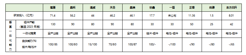 長期高強度的研發(fā)投入是科研實力長期引領(lǐng)的良性循環(huán)指標(biāo)。據(jù)上半年中標(biāo)規(guī)模TOP10企業(yè)2022年年報數(shù)據(jù)所示,企業(yè)年研發(fā)投入占營收的比例均約為5.44%,而排名TOP5的企業(yè)已與第二梯隊形成代際差。由于龍頭企業(yè)具備成本優(yōu)勢、資源優(yōu)勢和整合優(yōu)勢,相較于行業(yè)內(nèi)其它企業(yè)更具競爭力。對于技術(shù)研發(fā)和擴產(chǎn)的強勢布局,是龍頭企業(yè)戰(zhàn)略性的判斷和對技術(shù)領(lǐng)先的自信,亦是龍頭企業(yè)未來應(yīng)對產(chǎn)業(yè)爆發(fā)的交付儲備,垂直一體化自供能力達到80%的企業(yè)則具有更好的交付保障能力。