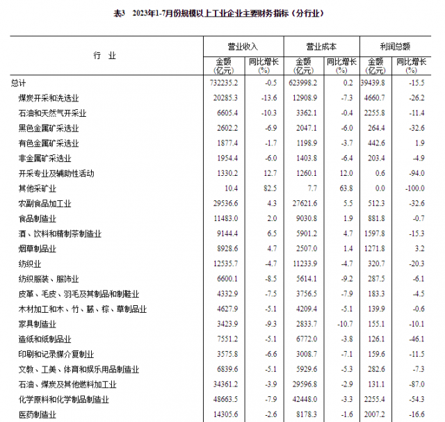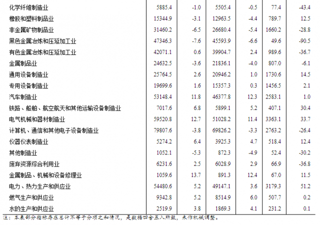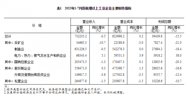 1—7月份,在41個工業(yè)大類行業(yè)中,13個行業(yè)利潤總額同比增長,28個行業(yè)下降。主要行業(yè)利潤情況如下:電力、熱力生產和供應業(yè)利潤總額同比增長51.2%,電氣機械和器材制造業(yè)增長33.7%,通用設備制造業(yè)增長14.5%,專用設備制造業(yè)增長2.1%,汽車制造業(yè)增長1.0%,石油和天然氣開采業(yè)下降11.4%,紡織業(yè)下降20.3%,煤炭開采和洗選業(yè)下降26.2%,計算機、通信和其他電子設備制造業(yè)下降26.4%,非金屬礦物制品業(yè)下降28.8%,農副食品加工業(yè)下降32.6%,有色金屬冶煉和壓延加工業(yè)下降36.7%,化學原料和化學制品制造業(yè)下降54.3%,石油、煤炭及其他燃料加工業(yè)下降87.0%,黑色金屬冶煉和壓延加工業(yè)下降90.5%。