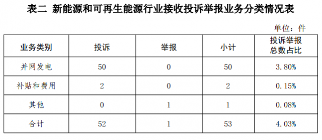 新能源和可再生能源行業(yè)排在第二位,數(shù)量為53件、占投訴舉報總數(shù)的4.03%,主要集中在并網(wǎng)發(fā)電、補(bǔ)貼和費(fèi)用等方面。