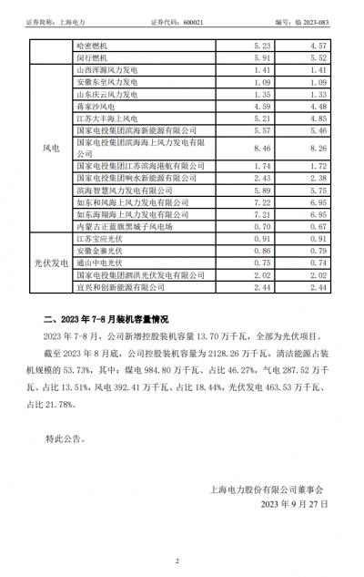 9月27日,上海電力發(fā)布2023年1-8月發(fā)電量完成情況公告。公告顯示,2023年1-8月,上海電力光伏發(fā)電完成38.34億千瓦時,同比上升7.61%;上網(wǎng)電量480.25億千瓦時,同比上升20.36%;上網(wǎng)電價均價(含稅)0.61元/千瓦時。