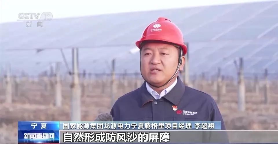 國家能源集團(tuán)龍源電力寧夏騰格里項目經(jīng)理 李超翔:我們通過建設(shè)光伏陣列自然形成防風(fēng)沙的屏障,并采用在地表扎草方格,實現(xiàn)防沙、固沙、治沙。在一期光伏項目2.8萬畝占地面積中,治沙范圍已超過2.6萬畝。