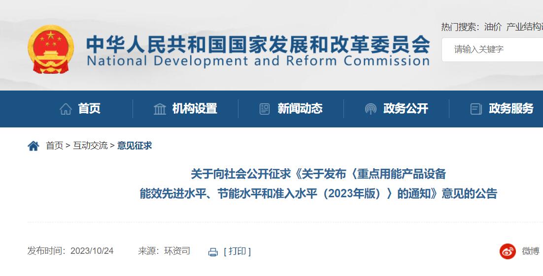 10月24日,國家發(fā)改委發(fā)布公告,就《關(guān)于發(fā)布〈重點用能產(chǎn)品設(shè)備能效先進(jìn)水平、節(jié)能水平和準(zhǔn)入水平(2023年版)〉的通知(征求意見稿)》公開征求意見。