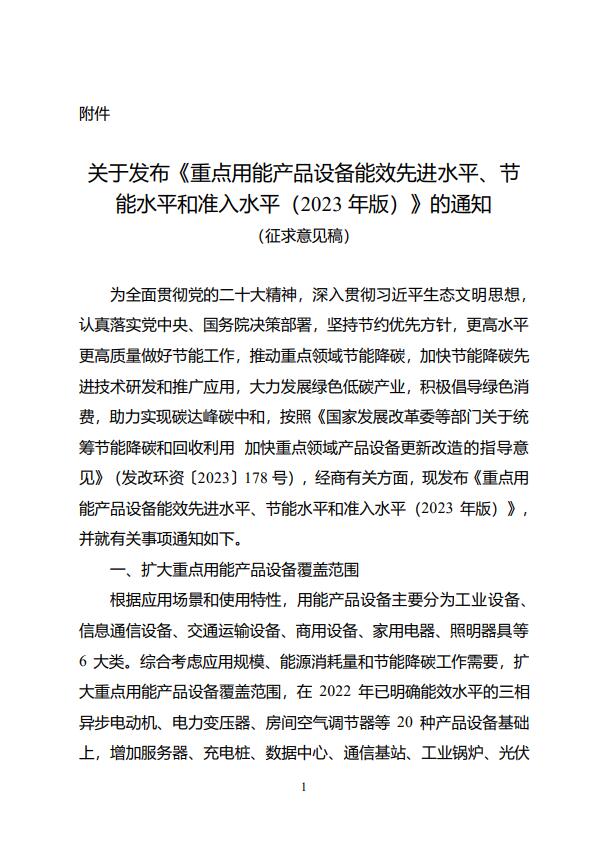 附件:關(guān)于發(fā)布《重點用能產(chǎn)品設(shè)備能效先進(jìn)水平、節(jié)能水平和準(zhǔn)入水平(2023年版)》的通知(征求意見稿)
