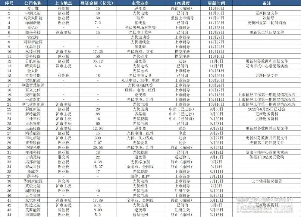 光伏公司IPO進度一覽表 數(shù)據(jù)來源:交易所網(wǎng)站、公開資料 制作:21世紀經(jīng)濟報道記者曹恩惠、實習生孫晨陽